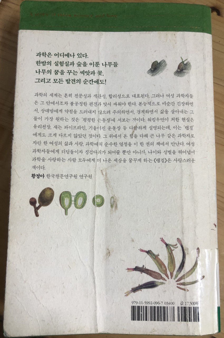 여성과학자를 무척 강조했던 책이다. 여성 과학자가 식물을 나무를 관찰하고 이야기하는 책이라고 했다. 아니 그렇게 여겼다. 표지도 세밀화라 맘에 들었다. 심지어 도서관에서 빌린 책은 너무 너무 많은 손을 거친듯이 앞 표지와 뒷 장이 많이 구겨지고 훼손되어 있었다. 다 읽고 나서는 '너무 TMI야. 좀 이기적으로 보이는데' 라는 생각이 먼저 떠올랐다.