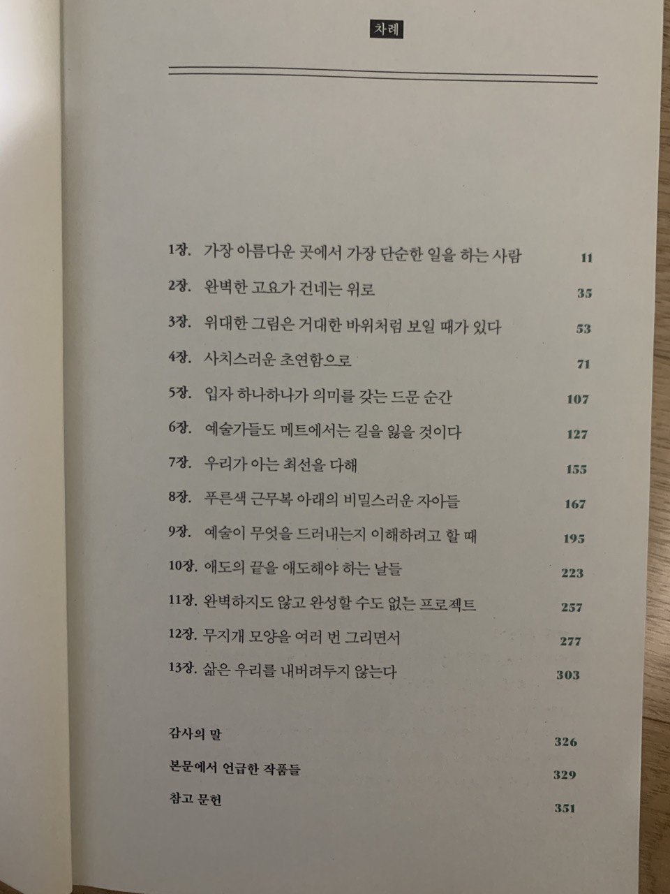 P324, 예술은 우리가 세상이 그대로 멈춰 섰으면 하는 순간에서 비롯한다. 너무도 아름답거나, 진실되거나, 장엄하거나, 슬픈 나머지 삶을 계속하면서는 그냥 받아들일 수 없는 그런 순간 말이다. 예술가들은 그 덧없는 순간들을 기록해서 시간이 멈춘 것처럼 보이도록 한다.