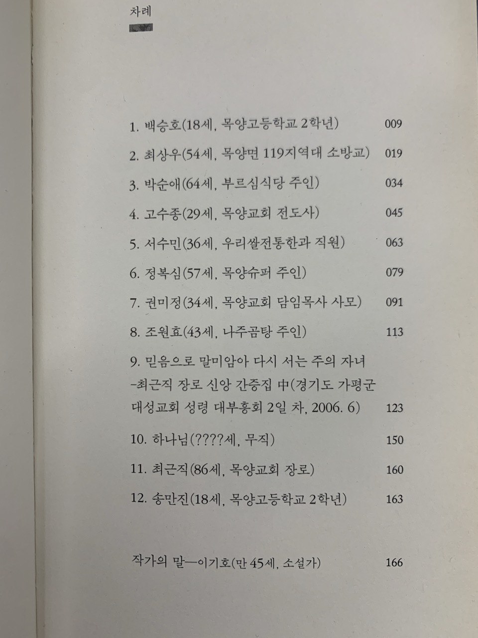 하나님을 믿는 그도 "고통에 무슨 뜻이 있다고"라고 묻는다. 하나님은 스스로 자신은 대답하는 자가 아니라 질문하는 자라고 한다. 소방대원인 최상우는 시골에서의 소방관의 일을 정말 리얼하게 말한다. 말끝마다 여긴 목양면이라고 하며. 부동산을 하는 나주곰탕집 주인 조원효는 신도시 택지 개발하면 목사들이 종교부지 분양받으려고 난리들을 친다며. 기도를 많이 해서 그런가 감도 좋고 무슨 모세같이 계속 젖과 꿀이 흐르는 땅만 찾아서 떠나고 또 떠난다는 말을 하는데 이 말들도 넘 센스있는 비틀기였다.