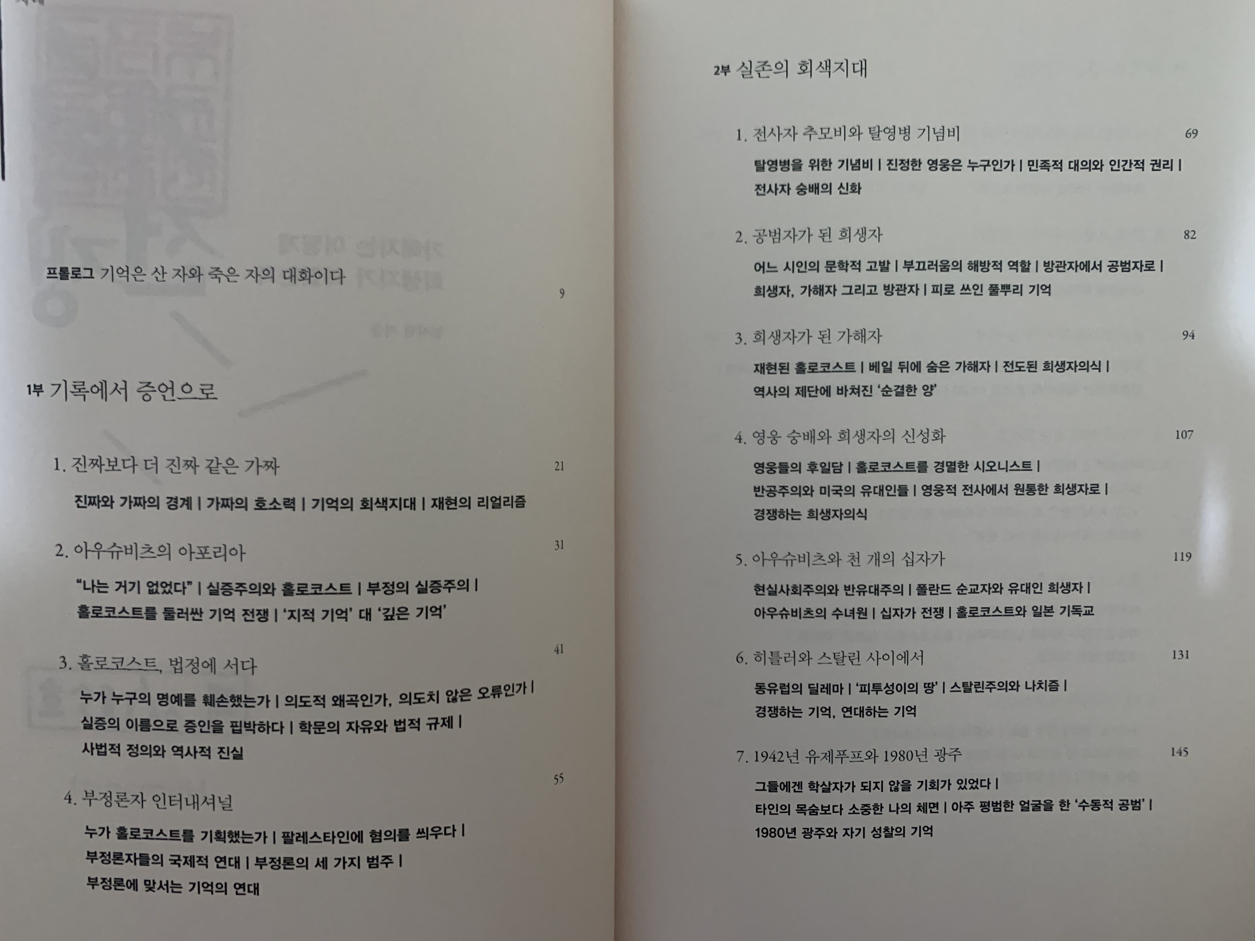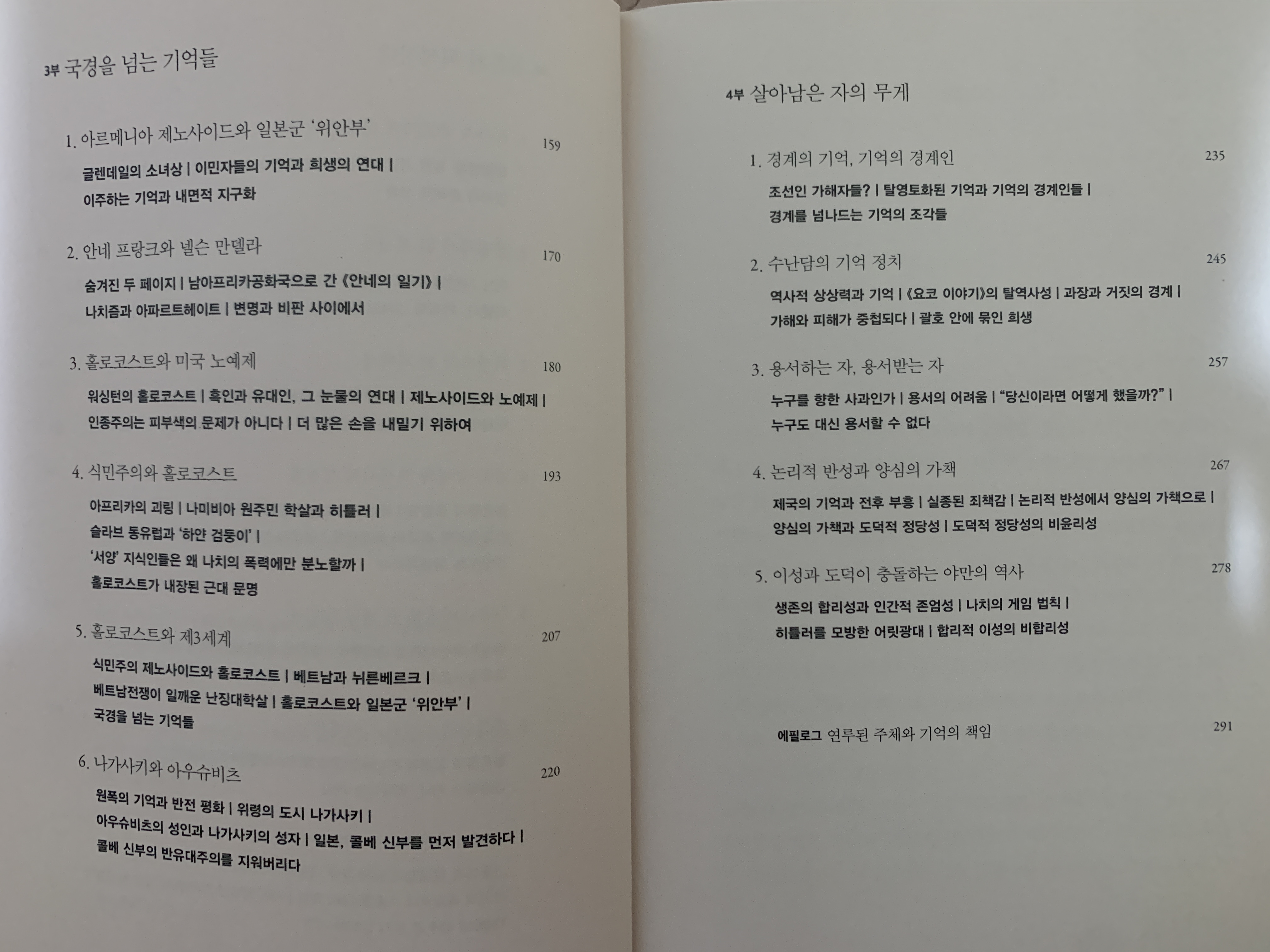 홀로코스트. 누구도 그것이 잘못된 것이 아니라고 할 수 없는 사실 그 자체. 그래도 현실 세계에서는 다양한 이유로 비교되고 뒤집어지고 연결되면서 왜곡되기도 한다. 목차만 봐서는 무슨 내용인지 감을 잡기가 어렵다. 다 읽고 정리하는 중에도 내 머릿속에서는 깔끔하게 정리되지 않고 있다. 남기고 싶은 줄글이 많아서인지도 모른다.